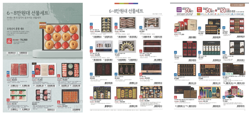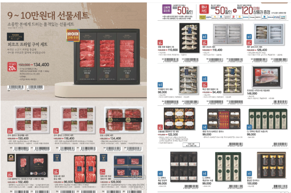 마지막으로 9~10만원대 선물세트입니다. 피코크 프라임 구이세트부터 굴비세트 등 고급스러운 식재료의 선물세트들이 있습니다.