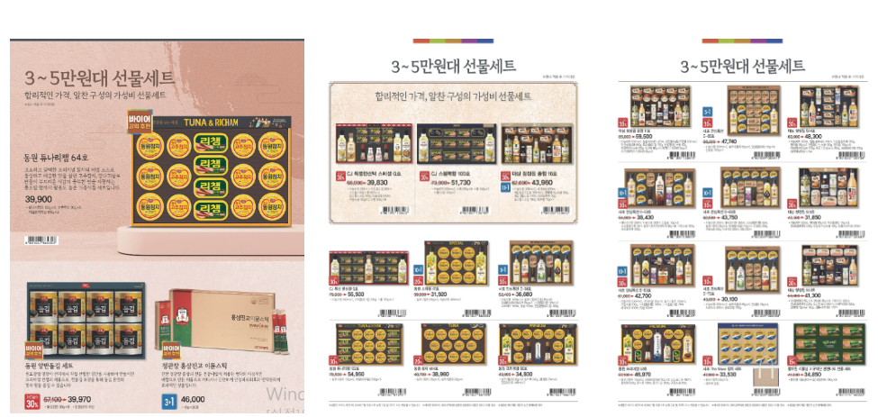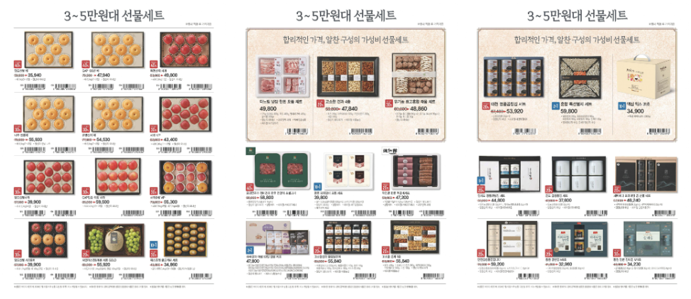 이마트 3~5만원대 선물세트는 참치캔, 햄 등이 더 많이 들어 있습니다. 과일도 품질이 놓은 사과와 배 세트가 있으니 살펴보시기 바랍니다.
